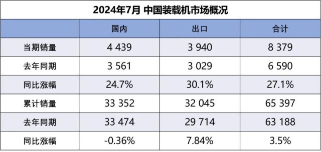 据中国工程机械工业协会对装载机主要制造企业统计,2024年7月销售各类装载机8379台,同比增长27.1%。其中国内市场销量4439台,同比增长24.7%;出口销量3940台,同比增长30.1%。