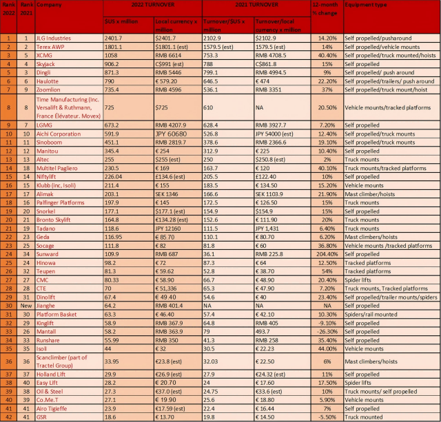 日前,KHL集团旗下世界知名高空作业平台杂志《Access International》发布“2022年全球高空作业平台制造企业20强”榜单(AccessM20)。