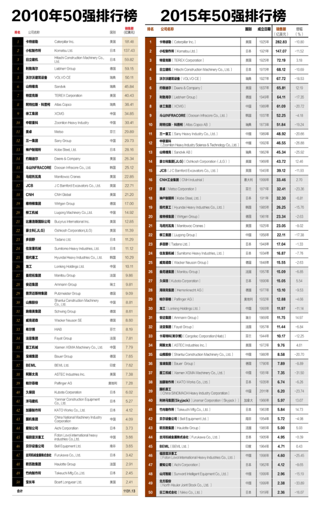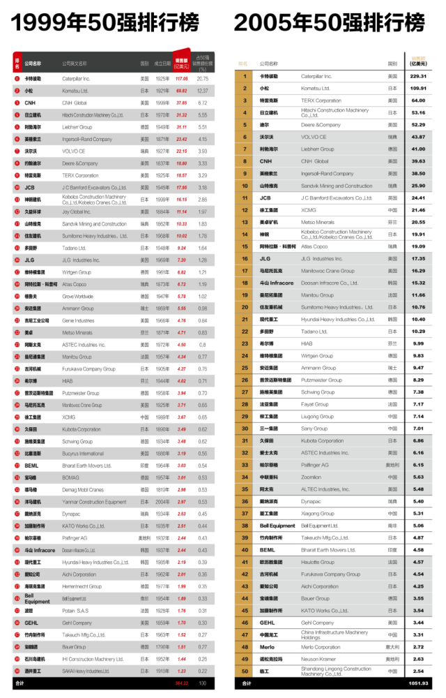 26年间,先后有26家企业退出50强榜单。其中8家因业绩不佳退出,如国机重工、厦工机械和印度BEML;另外18家则因被收购或合并而离场。
