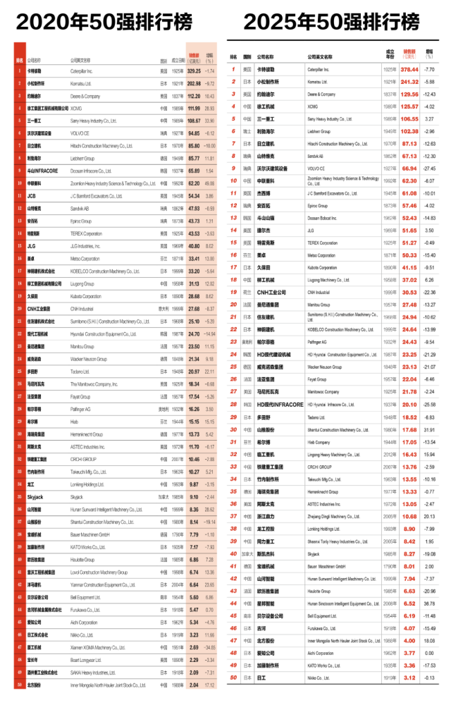 展望未来,站在2025年回望,50强榜单的变迁不仅是一部产业竞争史,更是全球产业转移、技术革命与经济周期的缩影。退场者印证“不进则退”,常青树彰显“强者恒强”,中国崛起势不可挡。随着智能化、电动化、数字化的深入,下一轮产业洗牌已在酝酿,兼具产业技术与市场敏锐度的中国企业有望实现新一轮突破。(来源:工程机械CCM)