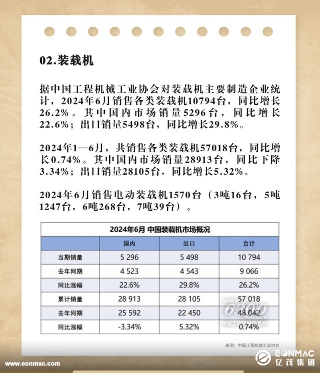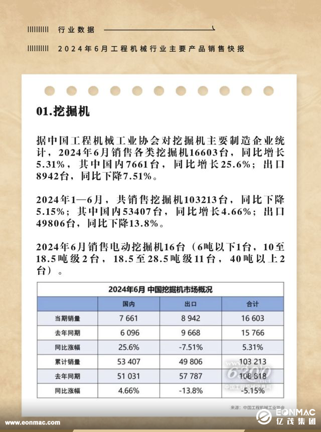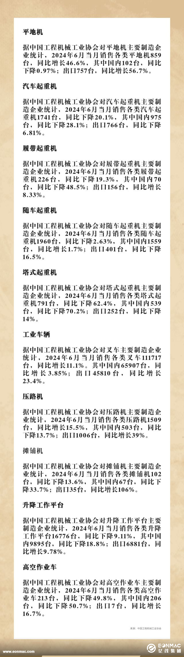 据海关数据整理,2024年6月我国工程机械进出口贸易额为48.46亿美元,同比增长5.35%,其中:进口额1.97亿美元,同比下降13.7%;出口额46.49亿美元,同比增长6.35%。